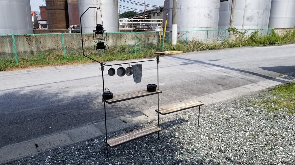 ランタンスタンドにジョイントテーブルを取り付けることで、自分だけのキッチンスペースが完成。横に並べるのもよし、L字形キッチンにするもよし。ジョイントのウッドは、アイアンの枠の中に入れているためとても扱いやすいです。